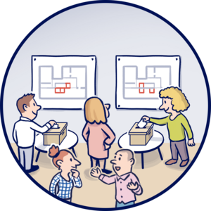 Im zweiten Workshop werden verschiedene Grundrissvarianten pro Geschoss zur Abstimmung gebracht. Basis für die Grundrissvarianten sind die Inputs & Anforderungen aus dem ersten Workshop.