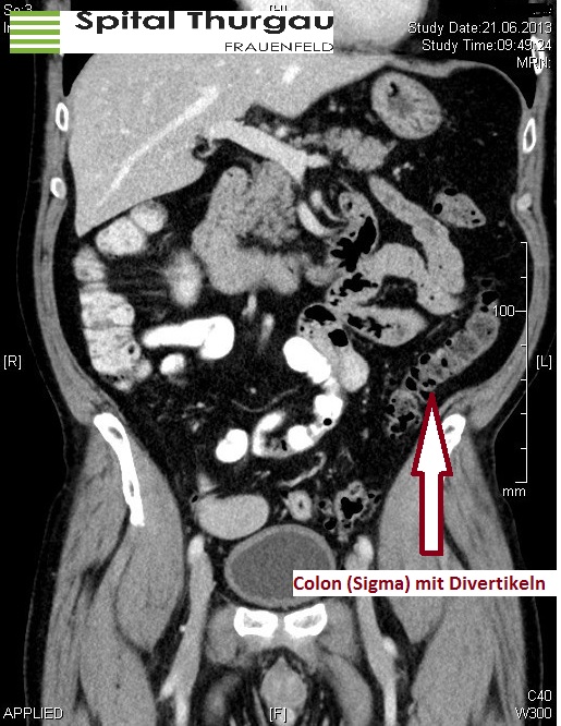 Beim erstmaligen Auftreten einer Divertikulitis wird eine Antibiotikatherapie eingeleitet. Oft erfolgt diese, gerade wenn bereits Fieber aufgetreten ist, intravenös und somit stationär. Wenn die Beschwerden rückgängig sind, kann auf Antibiotikatabletten gewechselt werden. Zu diesem Zeitpunkt ist die Therapie auch ambulant möglich. Die Spitalaufenthaltsdauer beträgt meist 2 - 4 Tage. Zur weiteren Diagnostik sollte nach 6 Wochen eine Darmspiegelung durchgeführt werden, um ein Tumorgeschehen sicher auszuschliessen und die Diagnose der Divertikulose nochmals zu bestätigen.