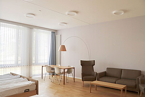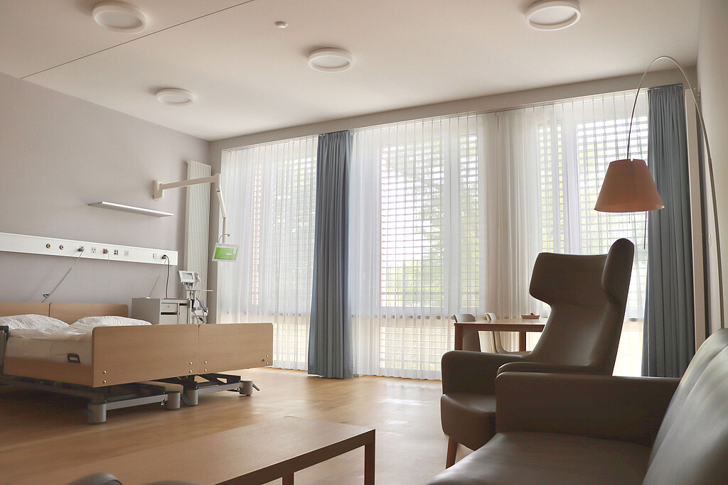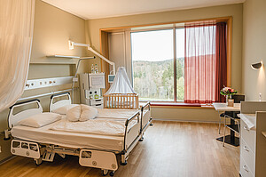 Unsere Wochenbettstation bietet Ihnen komfortable Ein- und Zweibettzimmer. Zusätzlich lädt Sie unsere Bistro-Lounge zum gemeinsamen Frühstücken mit Mitpatientinnen, Verweilen mit Familienangehörigen oder als ruhige Rückzugsmöglichkeit fürs Stillen ein.