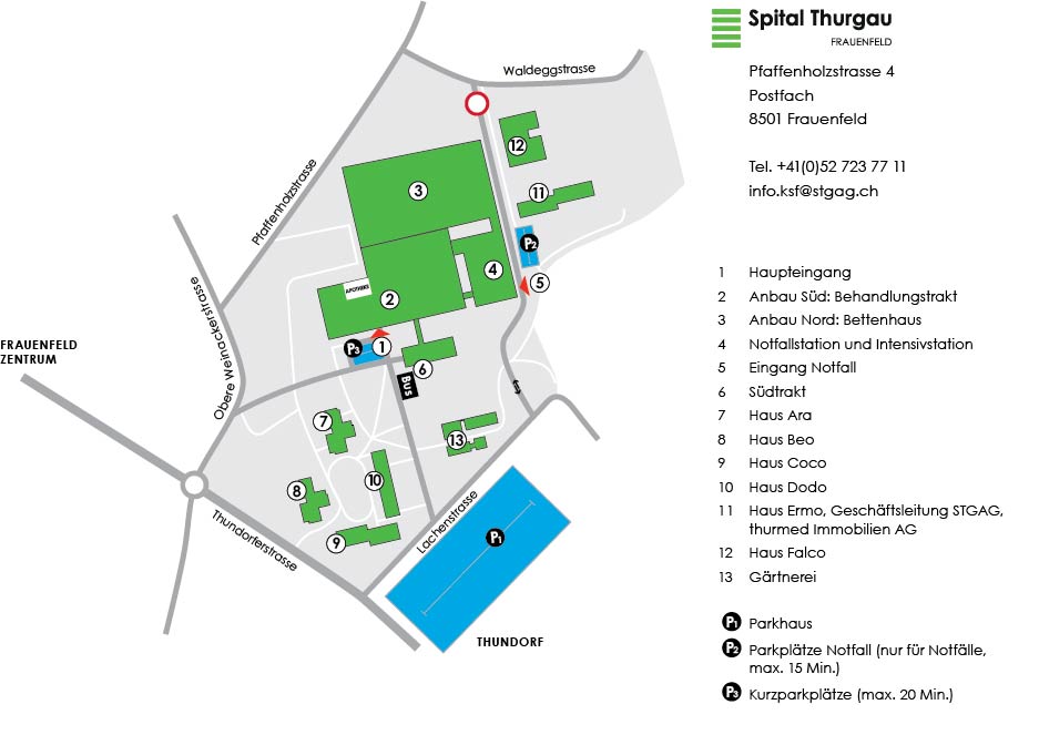 Das Kantonsspital Frauenfeld hat eine eigene Bushaltestelle „Kantonsspital“ direkt vor dem Haupteingang. Der Stadtbus und das Postauto bedienen diese Haltestelle mehrmals stündlich.