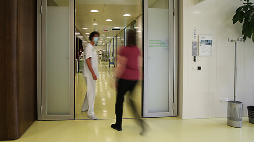 Die Türen der Intensivstation sind verschlossen. Die Klingel zur Anmeldung Ihres Besuchs rechts neben dem Eingang wird auf das Telefon der Intensivstation umgeleitet. Sollten Sie ein «Besetzt-Zeichen» hören, versuchen Sie es bitte einige Minuten später noch einmal.