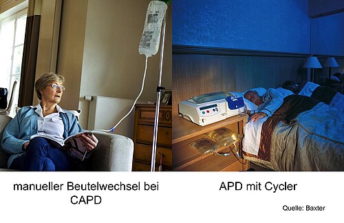 Wenn eine Transplantation medizinisch nicht möglich ist, vom Patienten nicht gewünscht wird, oder wenn die Wartefrist für eine Transplantation überbrückt werden muss, bleibt die Wahl zwischen einer Hämodialyse oder einer Peritonealdialyse. Beide Verfahren sind medizinisch seit Jahrzehnten erprobt und in wesentlichen Aspekten, vor allem auch hinsichtlich der Lebenserwartung, gleichwertig. In gewissen Fällen schliessen medizinische Gründe die eine oder andere Behandlungsform aus oder favorisieren eine Methode: eine Peritonealdialyse ist beispielsweise nicht möglich nach grösseren operativen Darmeingriffen. In den meisten Fällen jedoch sind aus medizinischer Sicht beide Verfahren möglich. Der Entscheid hängt dann im Wesentlichen von individuellen Faktoren ab: wie viel Unabhängigkeit wird von einem Patienten gewünscht? Wie viel Eigenverantwortung traut sich eine Patientin zu? Wie lässt sich der Zeitplan mit einer allfälligen Berufstätigkeit vereinbaren? Soll die Therapie zu Hause oder im Spital durchgeführt werden?