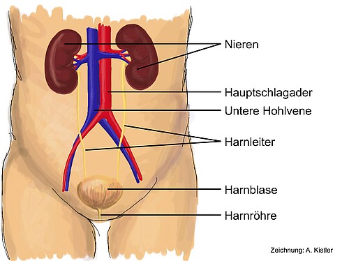 Jeder gesunde Mensch hat zwei Nieren, welche rechts und links von der Wirbelsäule im Bereich der Flanken liegen (siehe Abbildung). Die Nieren werden direkt aus der Hauptschlagader mit Blut versorgt. Etwa 10% des Blutes, das mit jedem Herzschlag durch den Körper gepumpt wird, durchfliesst die Nieren. Die Arterien, welche die Nieren mit Blut speisen, teilen sich wie die Äste eines Baumes in unzählige kleinste Arterien auf und münden in die Nierenkörperchen ("Glomeruli"). Diese funktionieren wie kleine Filter: Wasser, gelöste Salze und viele Abfallstoffe gelangen durch die Poren im Filter in den Harn, während Blutzellen und die meisten Eiweisse im Blut zurückbehalten werden. Auf diese Weise produzieren die Nieren eines gesunden Erwachsenen jeden Tag ca. 180 Liter "Primärharn", welcher anschliessend lange, geschlängelte Kanälchen (die "Tubuli") durchfliesst. Auf dem Weg durch diese Kanälchen werden dem Primärharn grosse Mengen an Wasser, Salz und anderen Stoffen wieder entzogen und ins Blut zurückgeführt, sodass schliesslich nur ca. 0.5 bis 3 Liter Urin täglich ausgeschieden werden. Die Giftstoffe hingegen verbleiben im Harn und werden durch diesen Prozess konzentriert und die Zusammensetzung des Urins kann genau reguliert werden. Aus den Tubuli gelangt der Urin in die Nierenbecken und von dort über die Harnleiter in die Harnblase, von wo er durch die Harnröhre ausgeschieden wird. Das Blut fliesst, nachdem es in den Glomeruli gefiltert wurde, weiter durch kleine Blutgefässe, welche die Tubuli umgeben. Dort nimmt es zurückgewonnenes Wasser und Salze auf und scheidet gewisse Stoffe direkt über die Tubuli in den Harn aus. Schliesslich verlässt das gereinigte Blut die Nieren wieder durch die Nierenvenen.