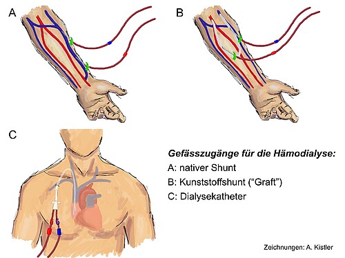Zur Durchführung einer Dialysebehandlung ist ein sogenannter Gefässzugang notwendig, der die kontinuierliche Entnahme und Rückführung des Blutes während der Behandlung ermöglicht. Hierfür wird in der Regel an einem Arm eine Vene mit einer Arterie verbunden und so ein "Shunt" bzw. eine "Fistel" gebildet (siehe Abbildung). Ein Shunt wird in einer kleinen Operation angelegt und muss sich danach über mehrere Wochen entwickeln bis er verwendet werden kann. In dieser Zeit wird die Shuntvene dicker und kräftiger. Für die Dialysebehandlung wird der Shunt dann jeweils mit zwei Nadeln angestochen - eine für die Entnahme des Blutes, eine für die Rückgabe. Bei schlechten Venenverhältnissen kann als Alternative zum Shunt ein Kunststoffschlauch ("Graft" oder "Gefässprothese") zwischen eine Arterie und eine Vene eingesetzt werden (siehe Abbildung). Falls eine Dialyse notfallmässig begonnen werden muss, so ist in der Regel die Einlage eines Katheters in eine Halsvene notwendig. Falls ein Katheter für längere Zeit benötigt wird (z.B. bis zum Reifen eines Shuntes), so kommen Katheter zur Anwendung, die weich sind und nach Austritt aus dem Blutgefäss unter der Haut verlaufen bis zur Hautdurchtrittsstelle im Bereich des Brustkorbes (siehe Abbildung). In seltenen Fällen stellt ein Katheter bei Patienten mit schwierigen Venenverhältnissen oder in anderen Ausnahmesituationen eine Dauerlösung dar. Ein Katheter birgt aber ein erhebliches Infektionsrisko und erlaubt keine gleich hohen Blutflussgeschwindigkeiten wie ein Shunt oder ein Graft.