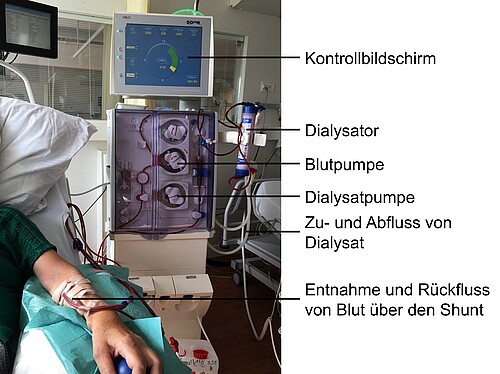Bei der Hämodialyse wird Blut dem Körper entzogen, in einem Dialysator ("künstliche Niere") gereinigt und wieder in den Körper zurückgeführt. Dabei werden während einer Behandlung kontinuierlich jede Minute ca. 200-400 ml Blut dem Körper entzogen, gereinigt und wieder zurückgeführt. Nur etwa 200ml Blut befinden sich dabei aber zu einem bestimmten Zeitpunkt jeweils ausserhalb des Körpers. Das Kernstück eines Dialysegerätes, der Dialysator, besteht aus zahlreichen kleinsten Hohlfasern ("Kapillaren"), durch welche das Blut fliesst, und welche von der Dialyseflüssigkeit ("Dialysat") umspült werden. Durch feine Poren in den Kapillaren können Wasser, Giftstoffe und Salze vom Blut ins Dialysat übertreten. Umgekehrt treten Puffersubstanzen (v.a. Bicarbonat) vom Dialysat ins Blut über und behandeln so die Übersäuerung des Körpers. Blutzellen und wichtige Bluteiweisse werden im Blut zurückbehalten. Der Dialyseapparat pumpt das Blut über ein Schlauchsystem in den Dialysator und von dort wieder zurück in den Blutkreislauf und regelt dabei exakt die Blutflussgeschwindigkeit, die Zusammensetzung und verwendete Menge des sterilen Dialysates und die Menge an Flüssigkeit, die dem Körper entzogen wird.