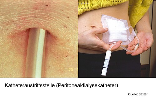 - Die häufigste Komplikation der Peritonealdialyse ist eine Infektion der Bauchhöhle ("Peritonitis"). Diese tritt meistens als Folge des Nichteinhaltens der Hygienevorkehrungen auf und äussert sich durch Trübung der Dialyseflüssigkeit, manchmal Bauchschmerzen und gelegentlich Fieber. Bei gut geschulten PD-Patienten tritt eine Peritonitis durchschnittlich etwa einmal alle 2-5 Jahre auf und lässt sich in der Regel rasch und gut mit Antibiotika behandeln. Seltener ist eine Infektion entlang des Katheters ("Tunnelinfekt"), welche die Einlage eines neuen Katheters notwendig macht.