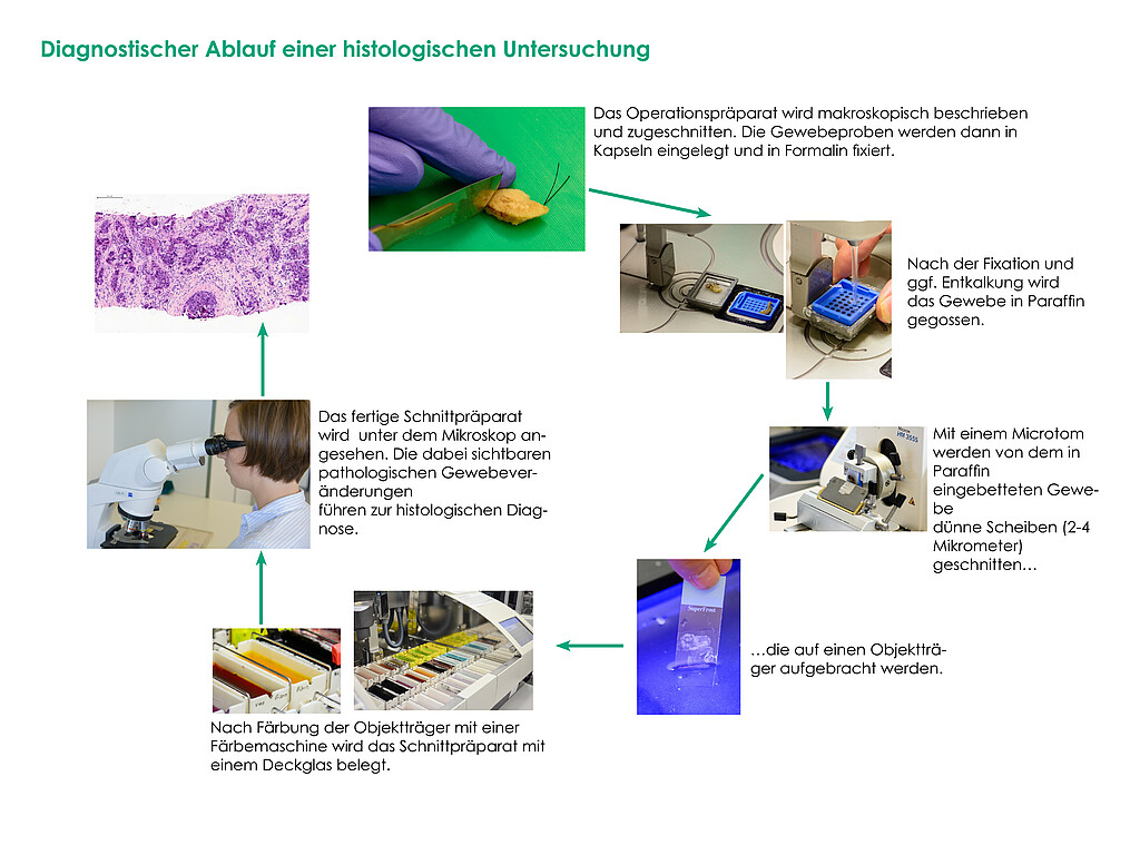 Wir untersuchen das gesamte Spektrum entnommener Gewebe aus Chirurgie, Gynäkologie, Urologie, Orthopädie, plastischer Chirurgie, Neurochirurgie, Gastroenterologie, Pulmologie, Hämatologie, ORL, Dermatologie und Radiologie. Hierbei kommen sowohl konventionelle histologische Untersuchungen (siehe Bild) als auch spezielle Zusatzverfahren zum Einsatz: