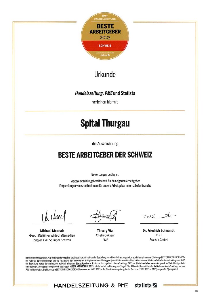 Mit grosser Freude und Stolz durfte die Spital Thurgau die Urkunde «Beste Arbeitgeber 2023 Schweiz» entgegennehmen. Die Spital Thurgau ist nun offiziell gelistet. Die Geschäftsleitung und das HR-Management bedanken sich herzlich bei allen Führungskräften und Mitarbeitenden für ihr tägliches Wirken und das gemeinsame Engagement für die Spital Thurgau und somit für die Thurgauer Bevölkerung!
