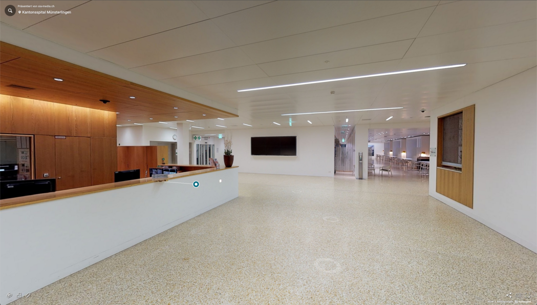 Damit sich Patienten und Besucher vor einem Spitalbesuch informieren und orientieren können, wurden neue 3D Aufnahmen mit modernster Technik erstellt. Dank einer innovativen Technologie konnte ein Teil des Spitalgebäudes Münsterlingen massstabsgetreu in 3D gescannt und anschliessend jeweils in ein 3D-Modell verwandelt werden. Sie können sich nun auf einen virtuellen 360-Grad-Rundgang ins Spital begeben. Patienten und Besucher erhalten einen realitätsnahen Einblick, welcher sie bei der Orientierung unterstützt. Der virtuelle Rundgang wird laufend mit neuen Bildern ergänzt.