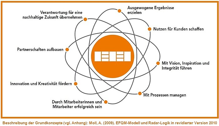 EFQM - European Foundation for Quality Management: Das EFQM Excellence Modell zeigt auf, was für den Erfolg hervorragender Organisationen entscheidend ist. Die Grundkonzepte der Excellence, die EFQM Modell-Kriterien und die bewertende RADAR-Logik liefern Institutionen Hinweise auf Ursache-Wirkungszusammenhänge wesentlicher Aspekte unternehmerischen Handelns.